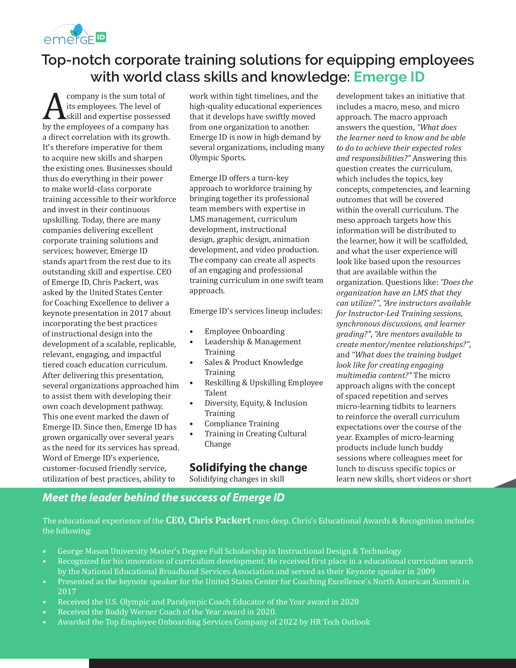 Our mission is to develop and deliver effective, efficient systems and processes organizations can use as engaging training solutions that lead to positive performance-based outcomes. Emerge ID continually strives for custom-fit solutions provided through a friendly approach by a highly skilled team of professionals.